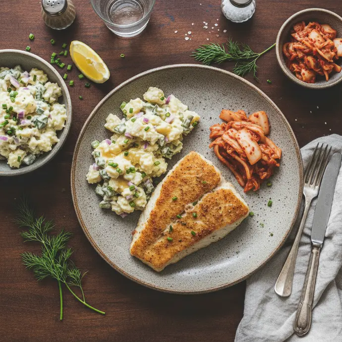 Pannfisch mit Kartoffelsalat und PANJANS Kimchi
